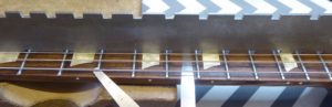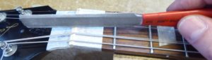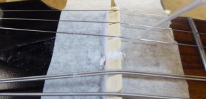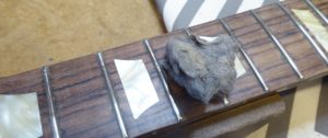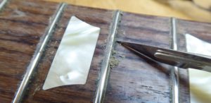 Getting right into the edges of the frets with a scalpel.